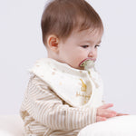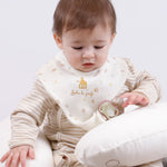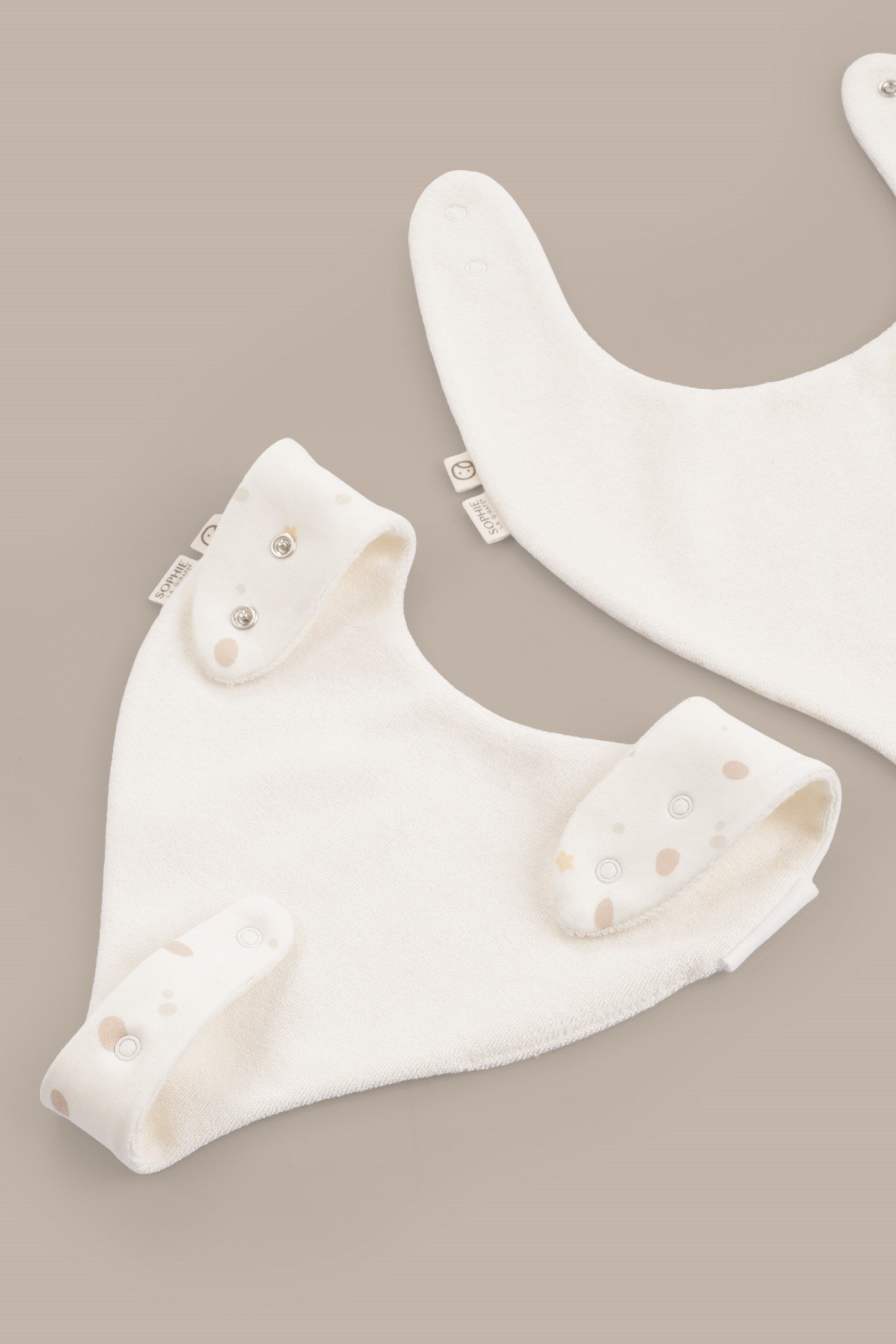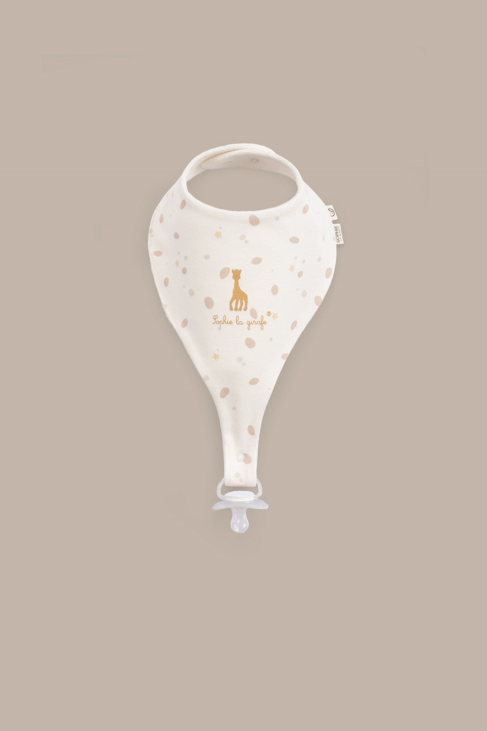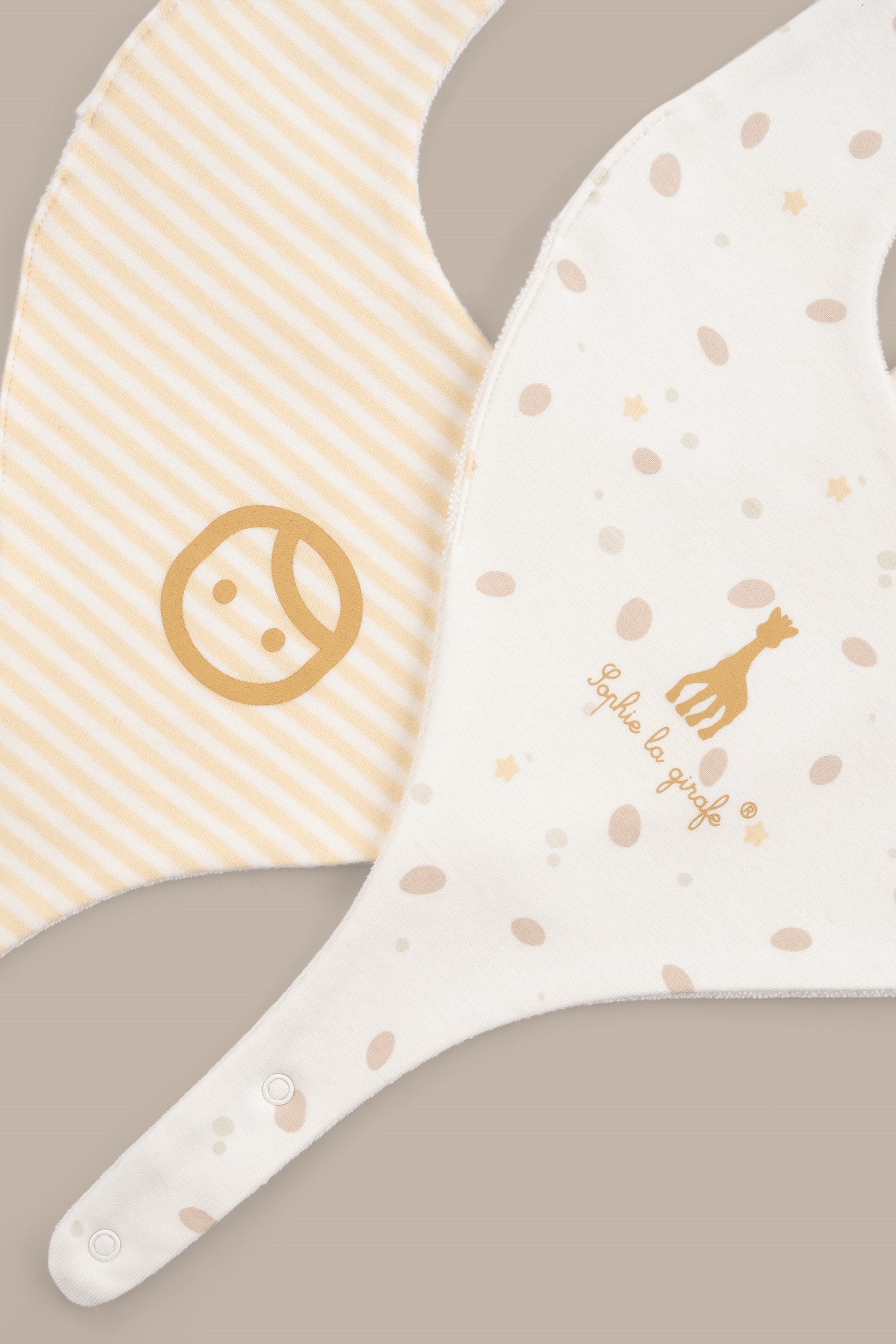 • %100 organik pamuk 2’li sıvı geçirmez emzik tutucu önlük seti Sophie la girafe baskılıdır.