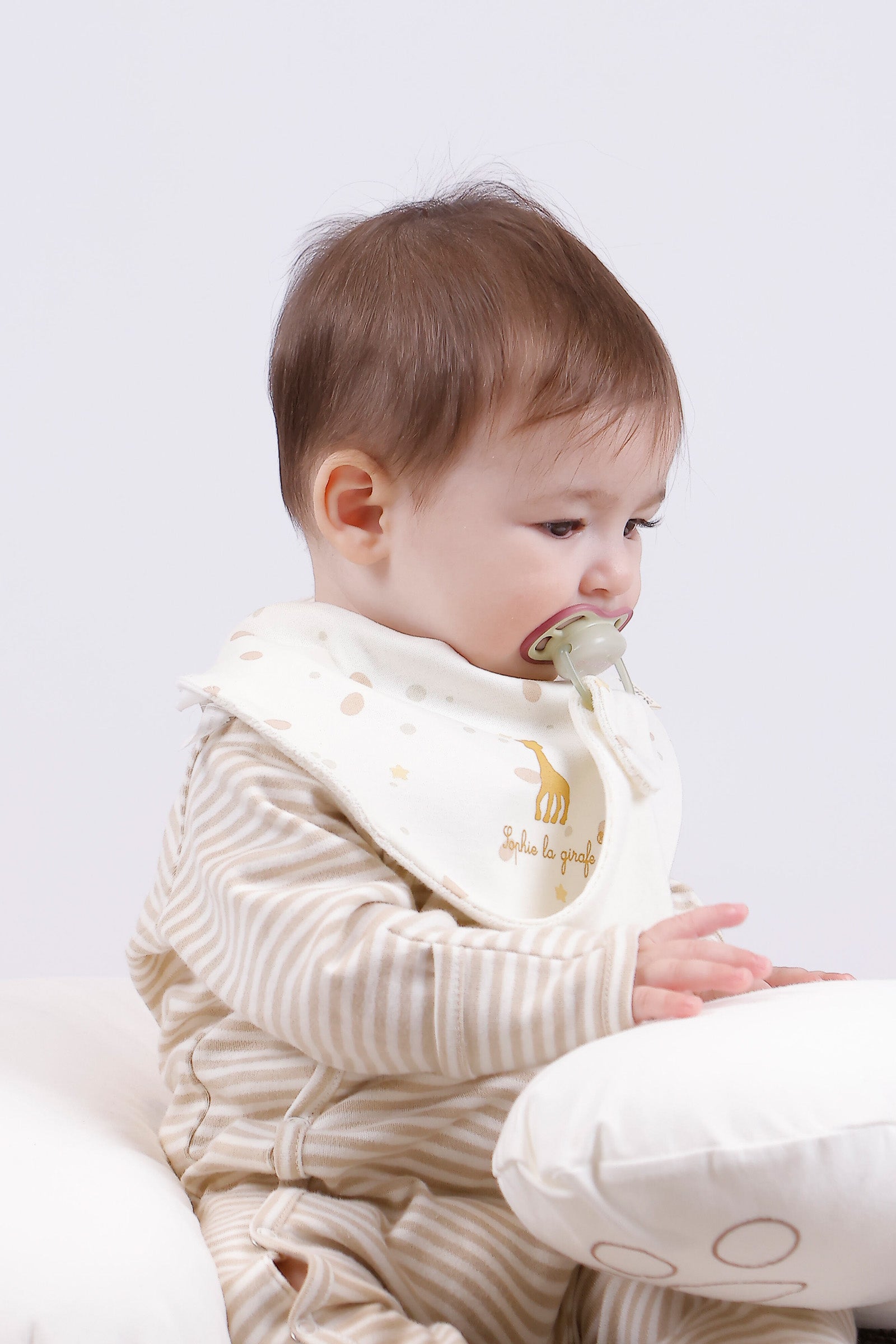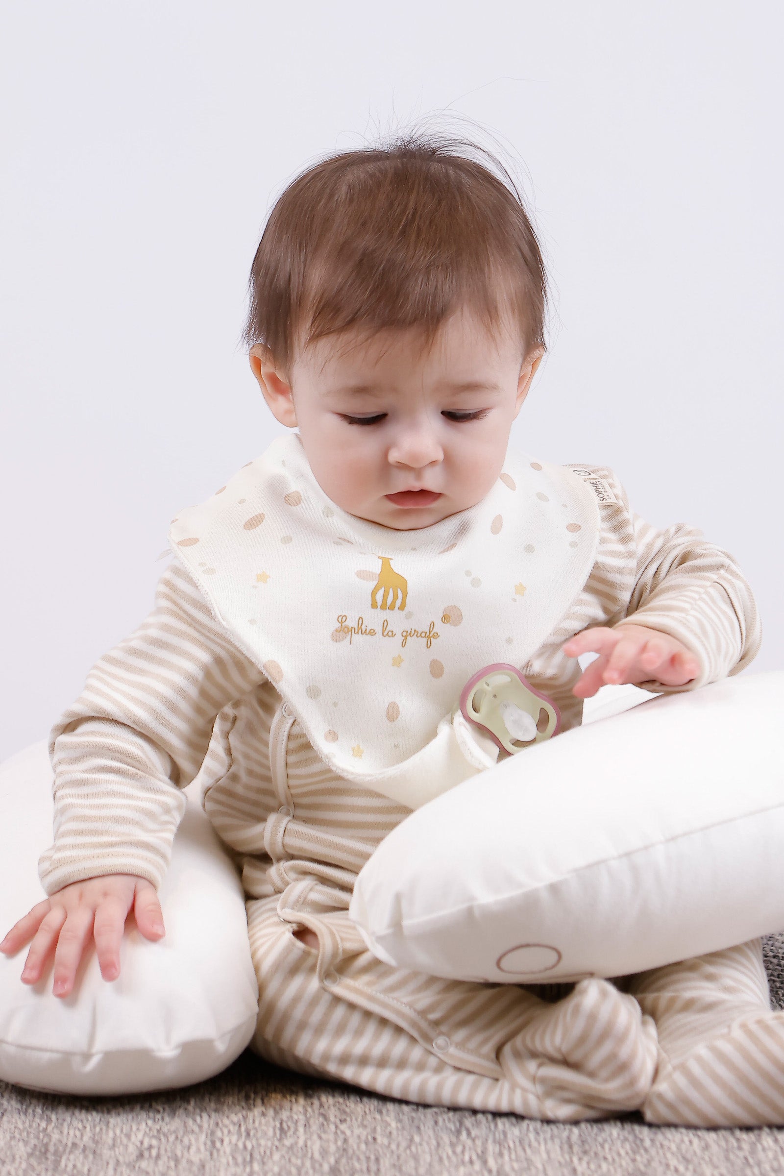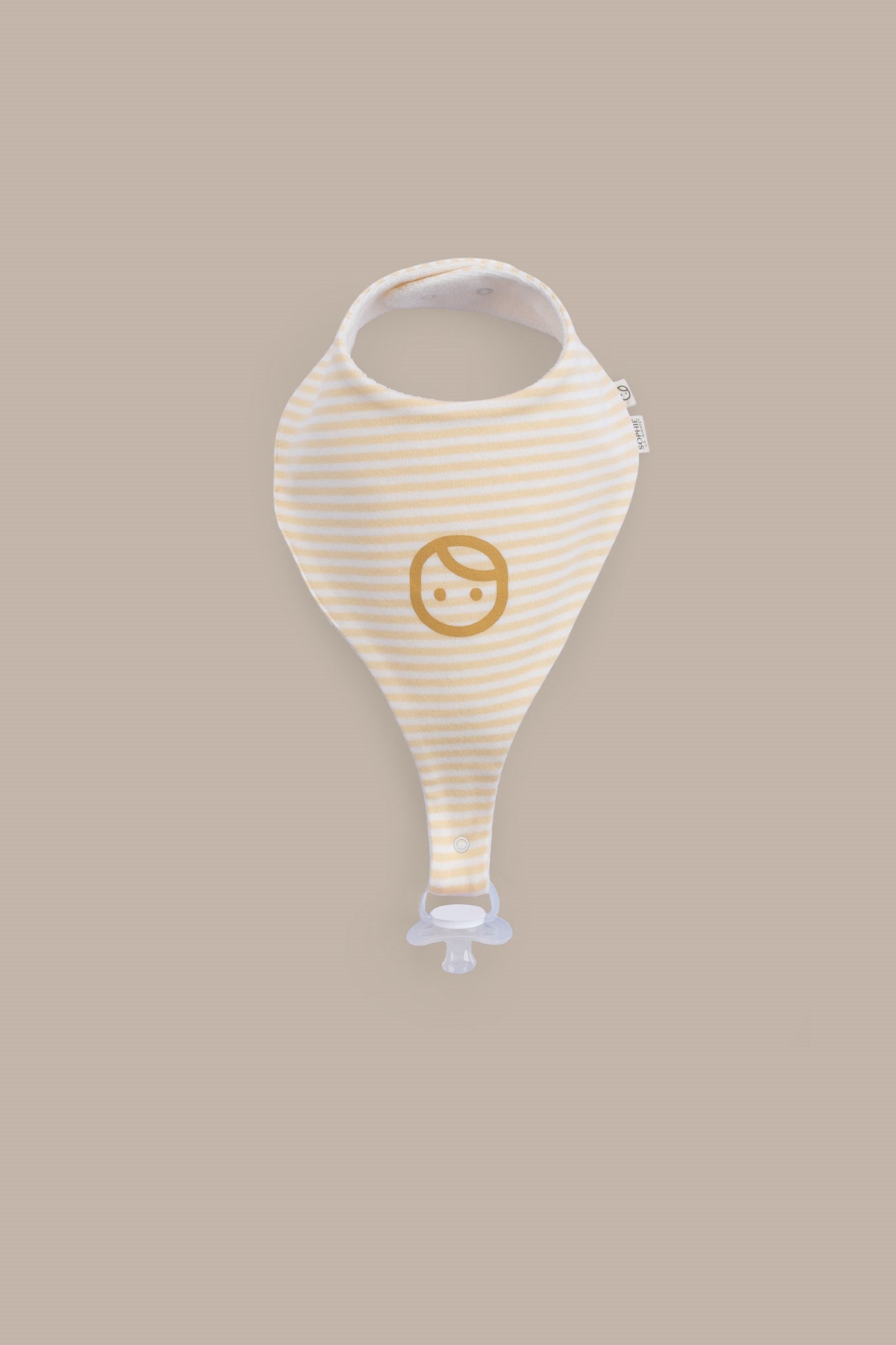 • Sophie la girafe x Little Gusto iş birliğiyle tasarlanan Sophie la girafe emzik tutucu önlük seti, %100 organik pamuktan üretilir.