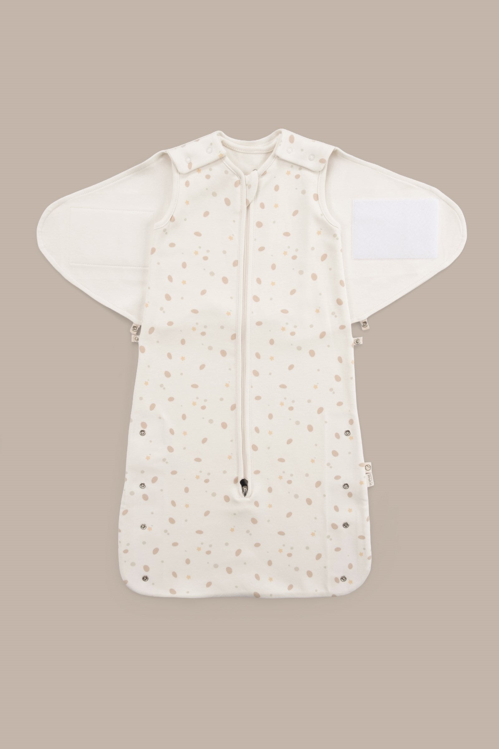Pelerin formunda tasarlanan ve uyku tulumuna sabitlenebilen ayarlanabilir çıtçıtlar, güvenli kullanım sağlar ve hareket sırasında kaymayı önlemeye yardımcı olur. Yenidoğandan 6 aya kadar rahatlıkla kullanılabilir.
