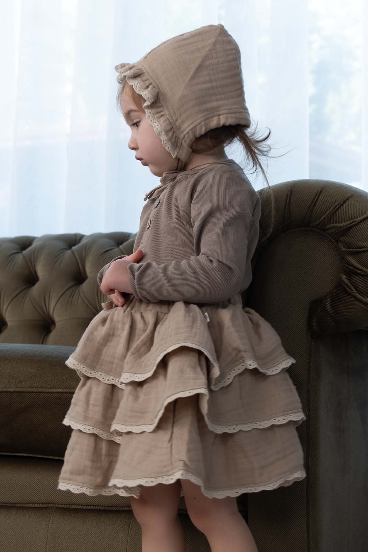 Üretim sürecimizin merkezinde ekolojik kumaşlar, etik değerler ve fonksiyonellik bulunur. Biz, zamansız kıyafetlerin gelecek nesillere aktarılabileceğine inanıyoruz. Bu nedenle her bir kız bebek eteği, sade çizgileri kaliteli kumaşlarla buluşturarak uzun yıllar değerini koruyacak şekilde tasarlanır.