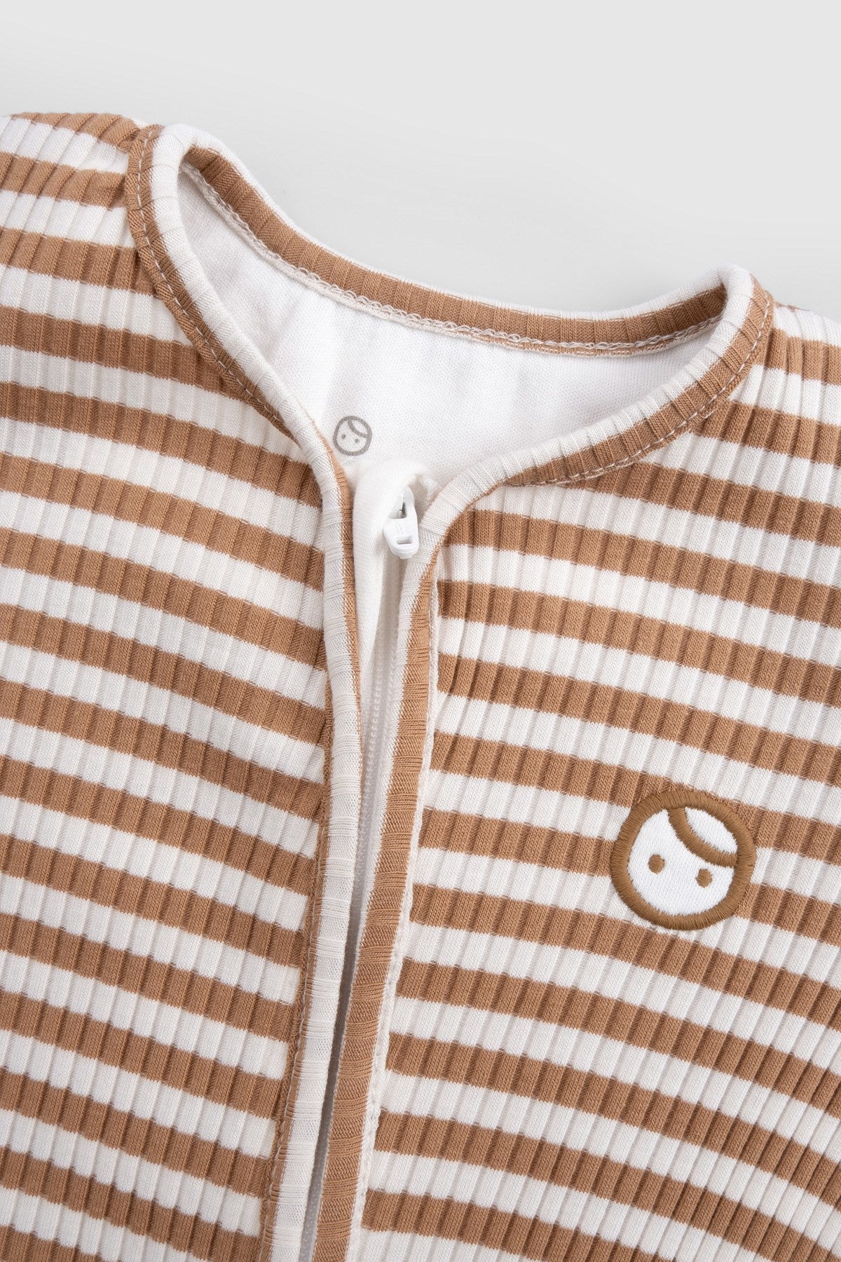 Kahverengi fermuarlı bebek tulumu, esnek yapısı ve dönüşebilir tasarımıyla kullanım sunar, pratik bir seçenek olarak öne çıkar 🌿