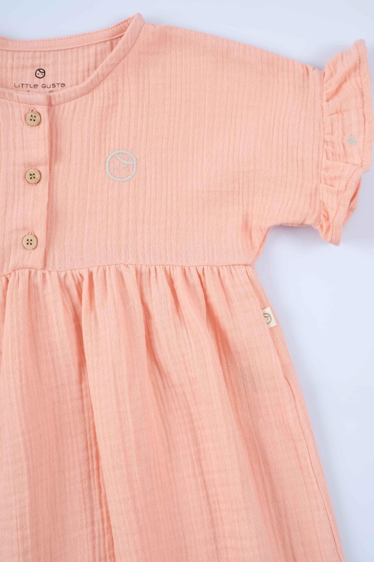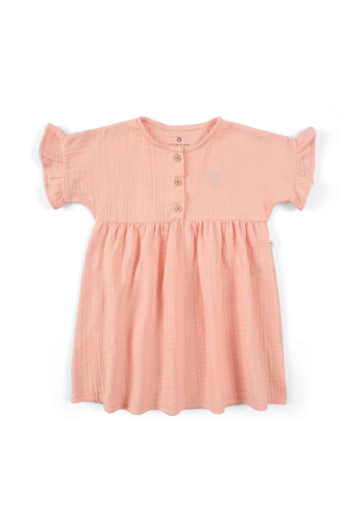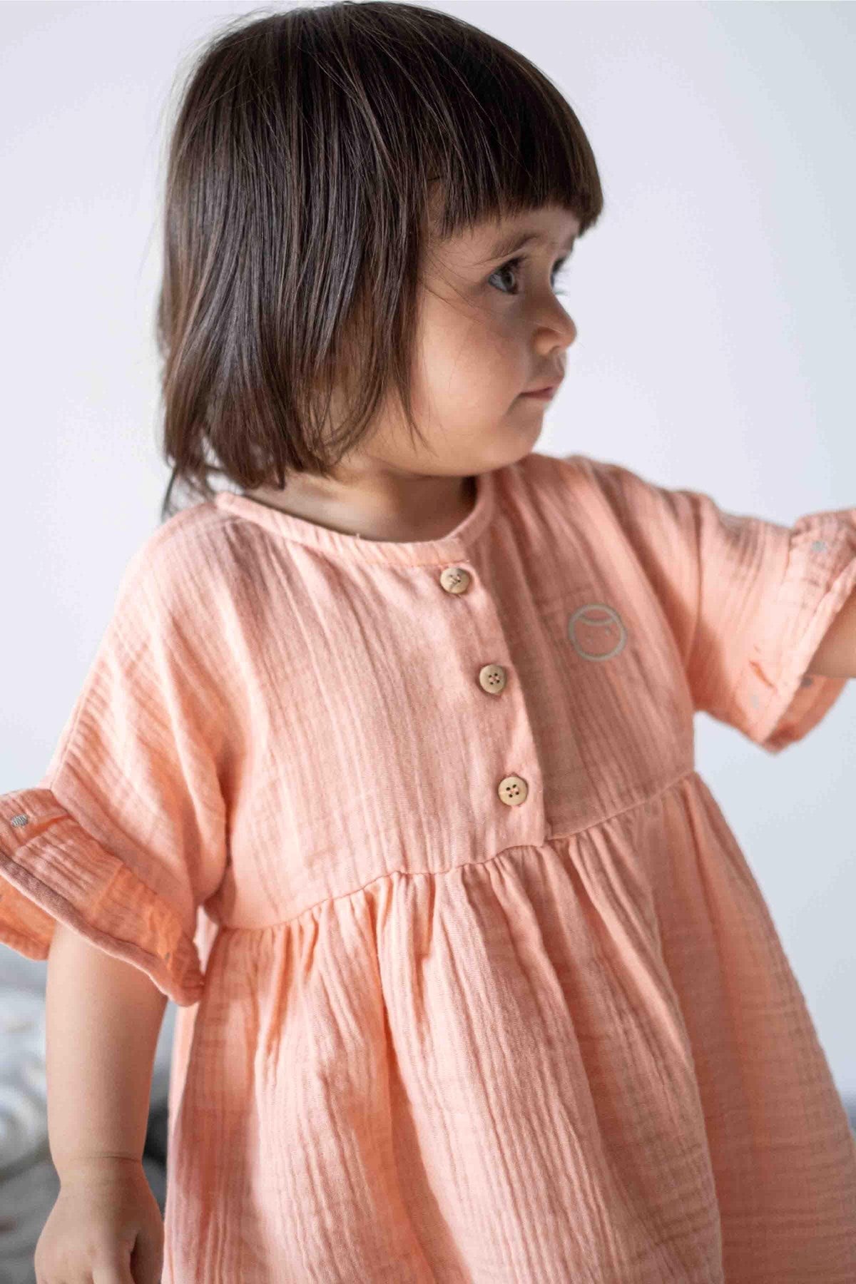 %100 organik pamuk müslin kumaştan üretilen çocuk elbisesi, yumuşacık kumaşı, nefes alan yapısıyla çok sevimli bir görünüme sahiptir. Kimyasal madde içermez.