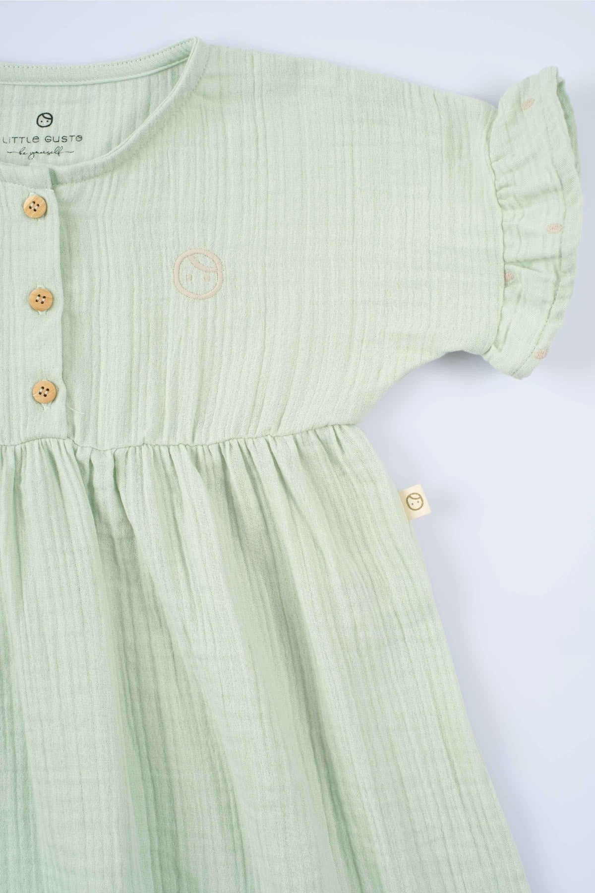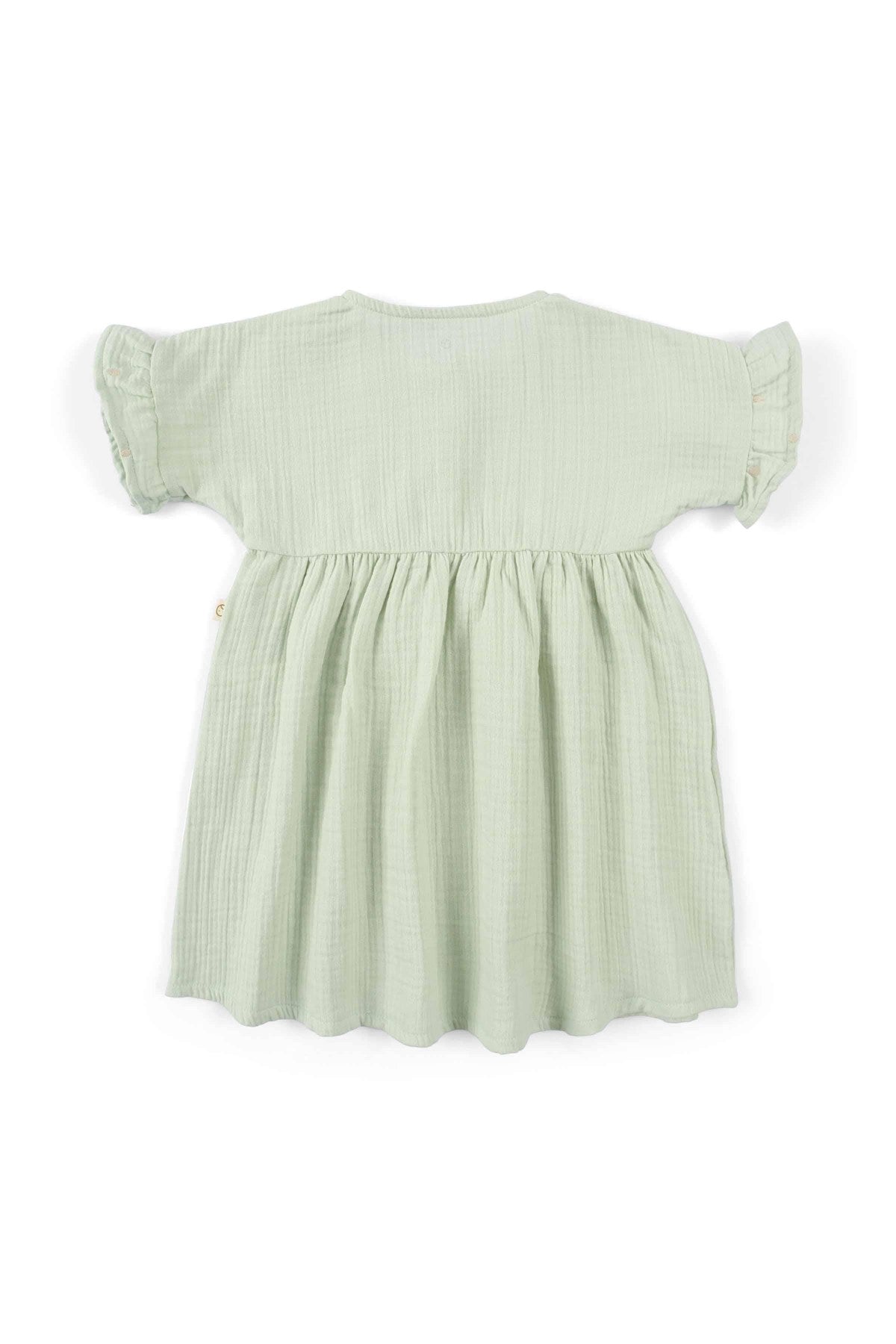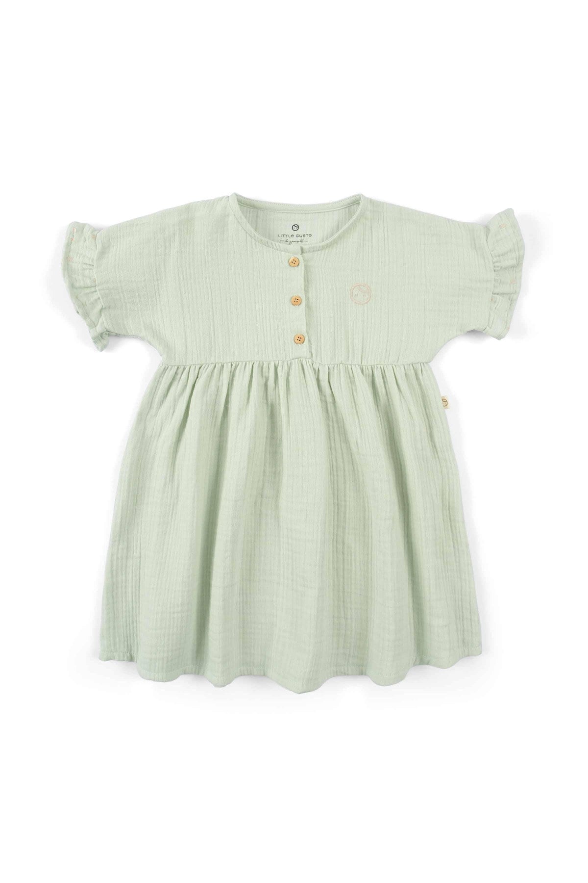 %100 organik pamuk müslin kumaştan üretilen çocuk elbisesi, yumuşacık kumaşı, nefes alan yapısıyla çok sevimli bir görünüme sahiptir. Kimyasal madde içermez.