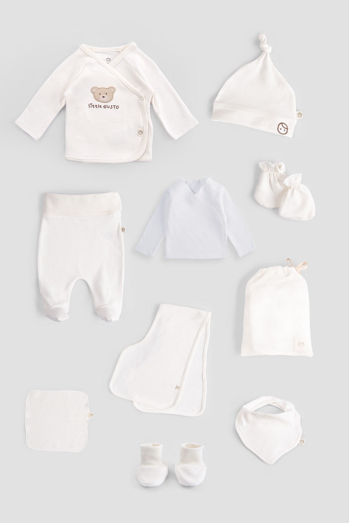 Little Gusto Organik Organik Pamuk 10'lu Ekru Hastane Çıkış Seti %100 organik pamuk kumaştan üretilmiştir. Organik pamuk kumaşın yumuşaklığı, nefes alan yapısı ve organik içeriğiyle yenidoğan bebeğinizin hassas cildine özel olarak üretilmiştir. Ekru hastane çıkış seti içeriğinde içlik, omuz bezi, bandana önlük, patikli pantolon, eldiven, ağız bezi, şapka, kruvaze üst, patik ve taşıma kesesi olmak üzere 10 parça ürün bulunmaktadır.